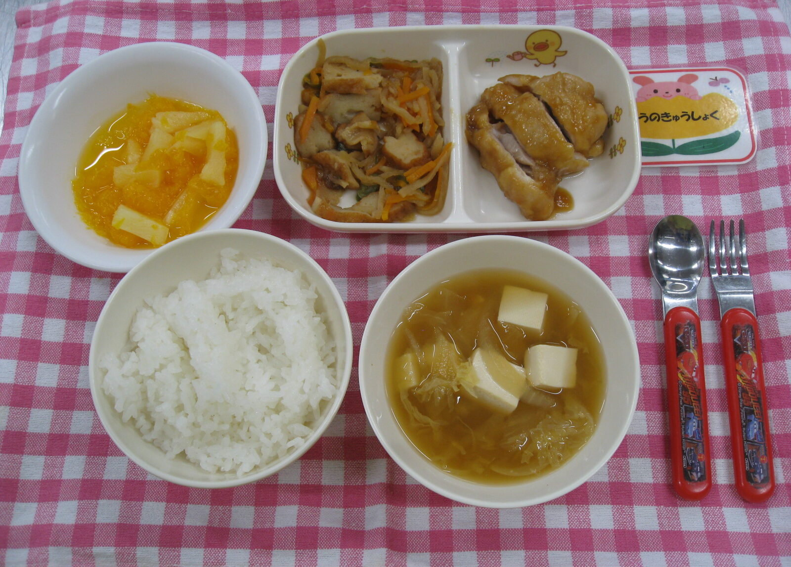 2025年10月14日 / 最終更新日時 : 2025年10月14日 共通 今日の給食 🍴今日の給食🍴*今日の給食* 御飯、みそ汁(豆腐・白菜)、鶏肉の照り焼き 切干大根の炒り煮、パイン・みかん🍍🍊🍍でした