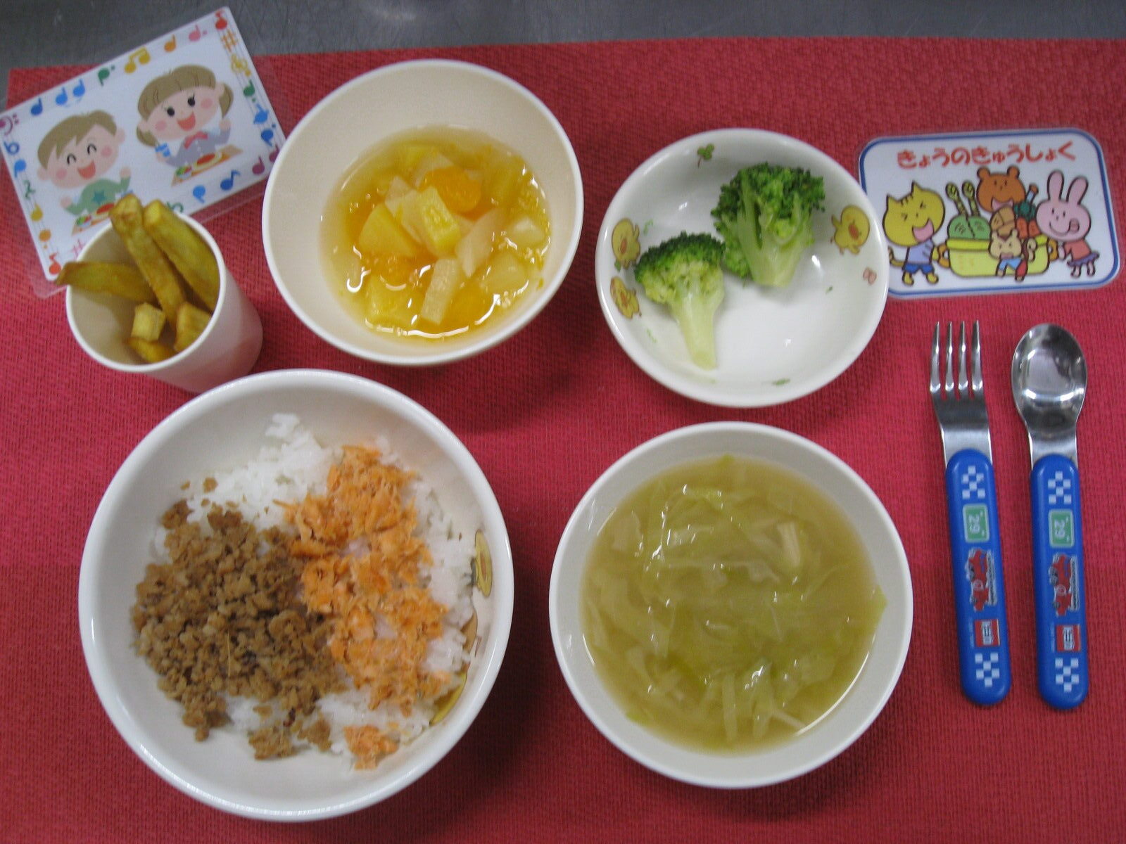 2025年11月14日 / 最終更新日時 : 2025年11月14日 共通 今日の給食 🍴今日の給食🍴*今日の給食* 七五三❤️ 二色どんぶり、みそ汁(キャベツ・えのき)、ブロッコリーマヨネーズかけ さつま芋スティック、フルーツカクテル🍊🍊🍊でした