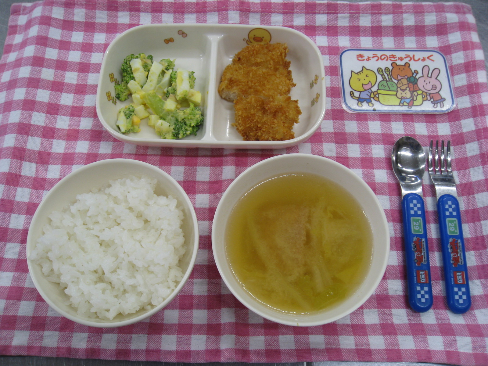 御飯、みそ汁(厚揚げ・白菜)、鶏かつ