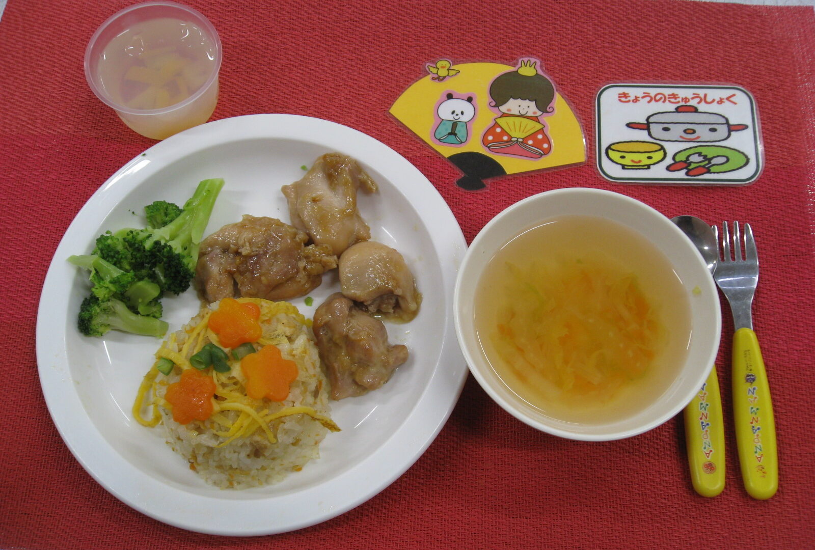 2026年3月3日 / 最終更新日時 : 2026年3月3日 共通 今日の給食 🍴今日の給食🍴*今日の給食* ひなまつり🎎 ちらし御飯、花形にんじんの甘煮、すまし汁 鶏肉の照り焼き、添え・ブロッコリー、桃のゼリー🍑🍑🍑でした
